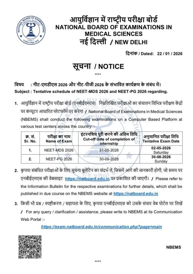 The National Board of Examinations in Medical Sciences (NBEMS) has officially released the tentative examination schedule for NEET PG 2026 and NEET MDS 2026.